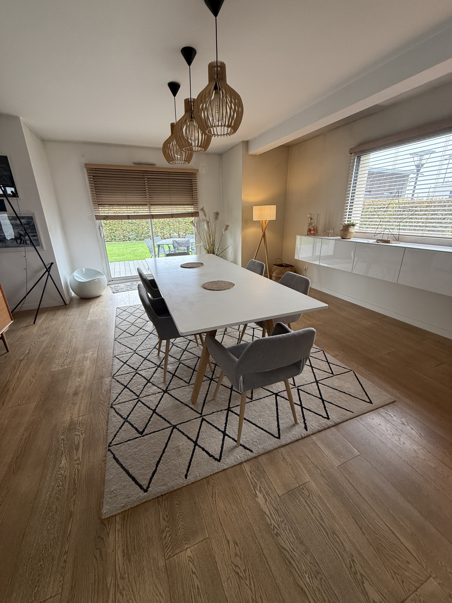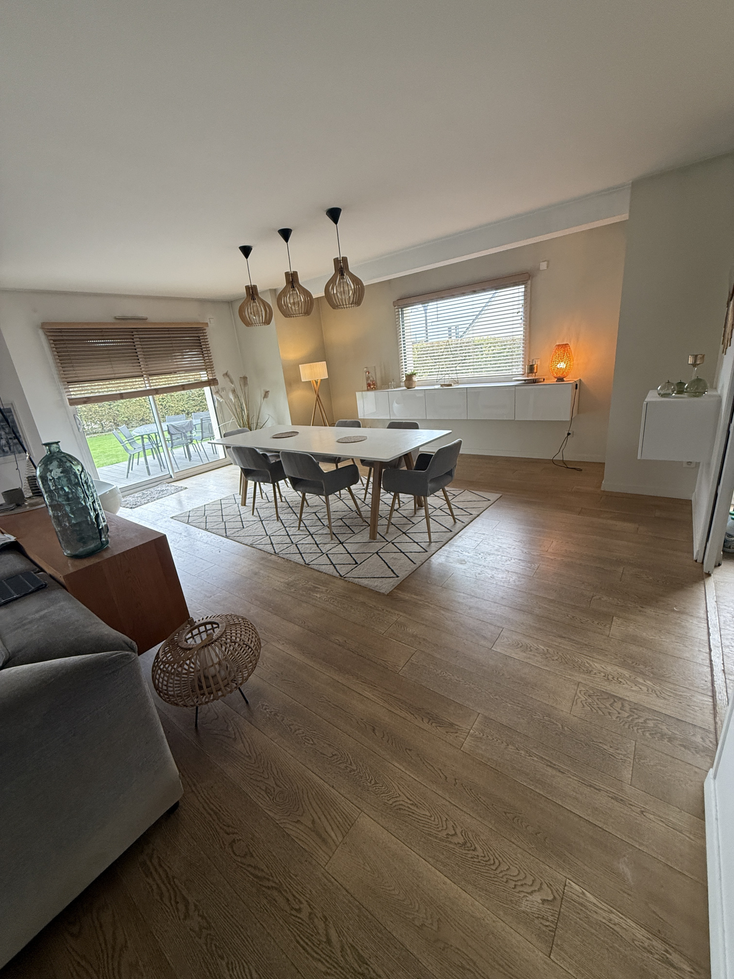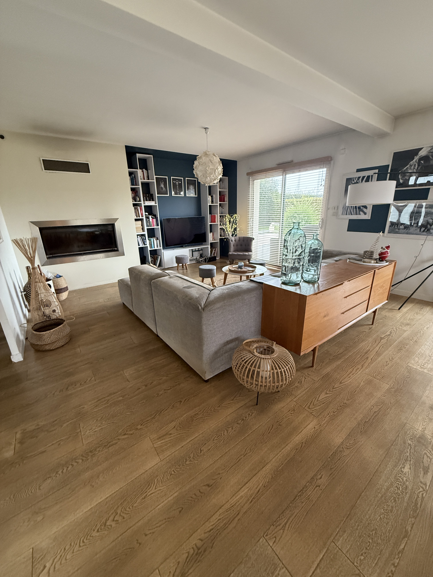 Superbe pièce de vie spacieuse et lumineuse avec cheminée et plancher chauffant par pompe à chaleur